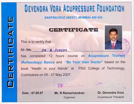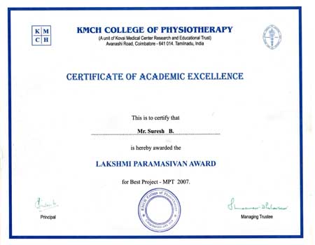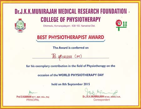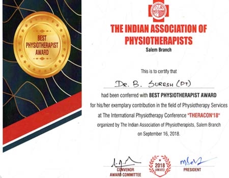 Dr. B. Suresh (P. T.) M. P. T. (Advanced PT in NEURO) is an alumni of KMCH Allied Health Sciences College (Under The Tamil Nadu Dr. M. G. R. Medical University). He was the Topper in advanced PT in NEUROLOGY. He is a specialist in Manual therapy with 25 years of professional experience for Treating and Curing Dysfunctions without medicines and surgery which otherwise would have needed surgery.