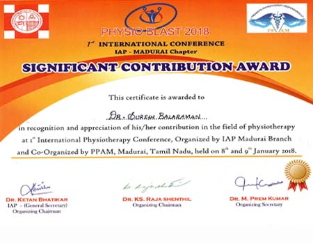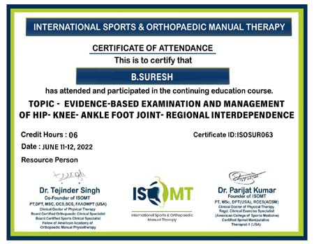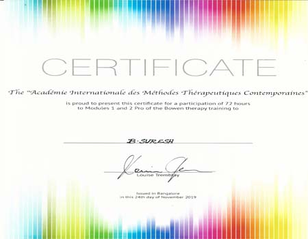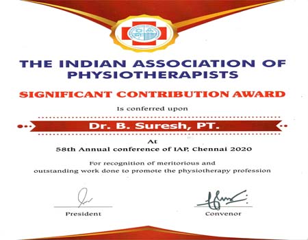 Dr. B. Suresh (P. T.) M. P. T. (Advanced PT in NEURO) is an alumni of KMCH Allied Health Sciences College (Under The Tamil Nadu Dr. M. G. R. Medical University). He was the Topper in advanced PT in NEUROLOGY. He is a specialist in Manual therapy with 25 years of professional experience for Treating and Curing Dysfunctions without medicines and surgery which otherwise would have needed surgery.